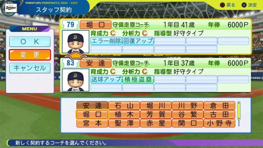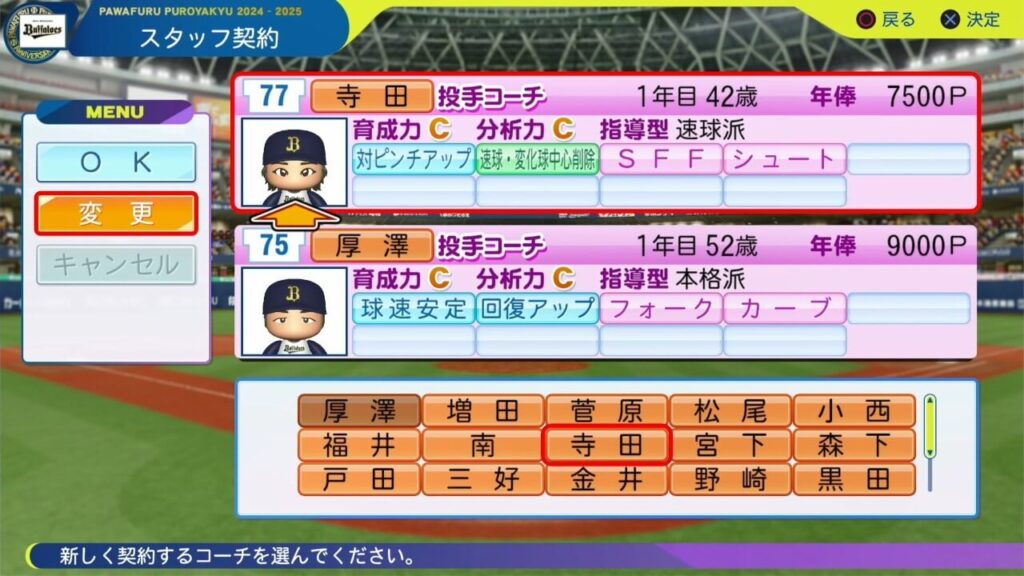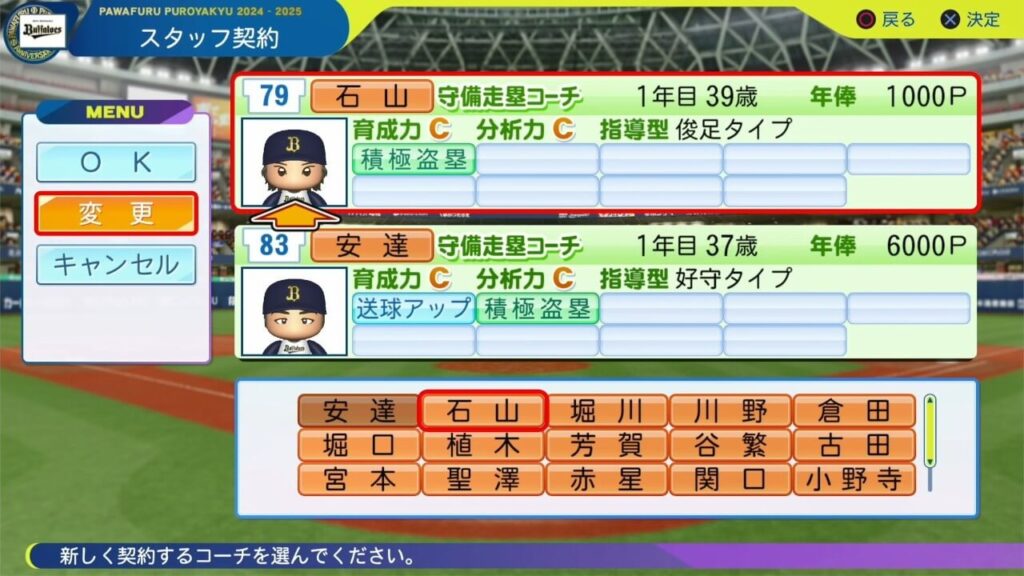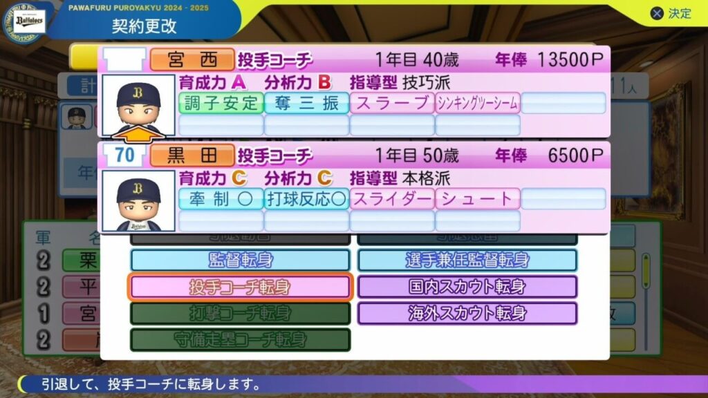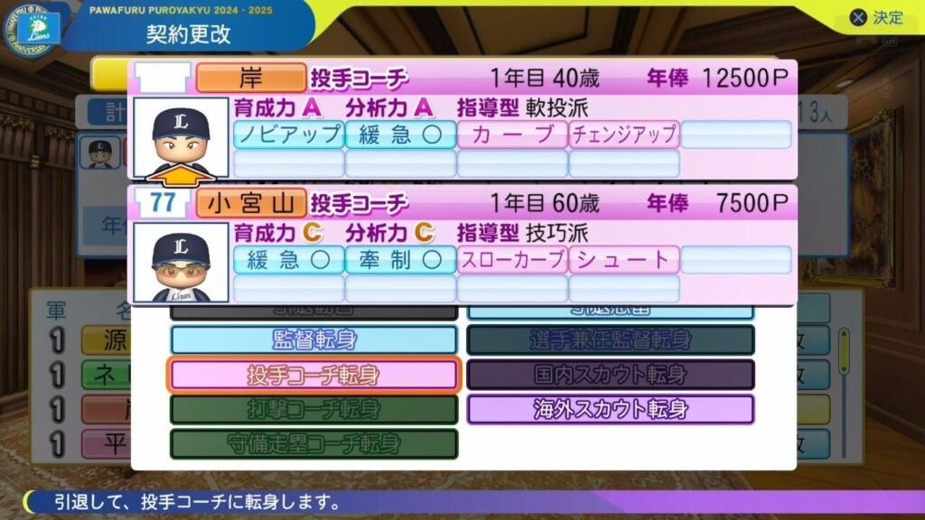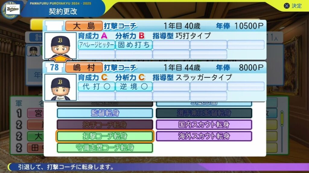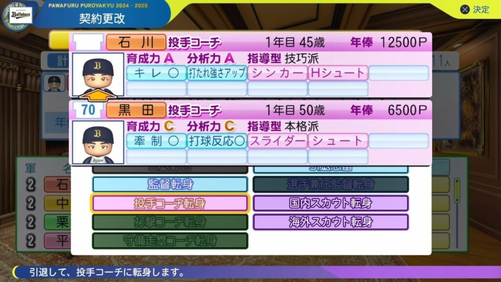1年目のオフに設定できるコーチですね。契約更改のスタッフ選択画面ではなく、そのあとの選手のコーチ転身で指名するのが基本です。