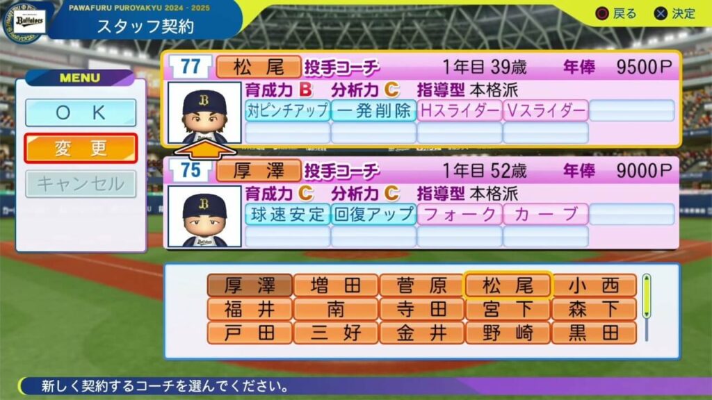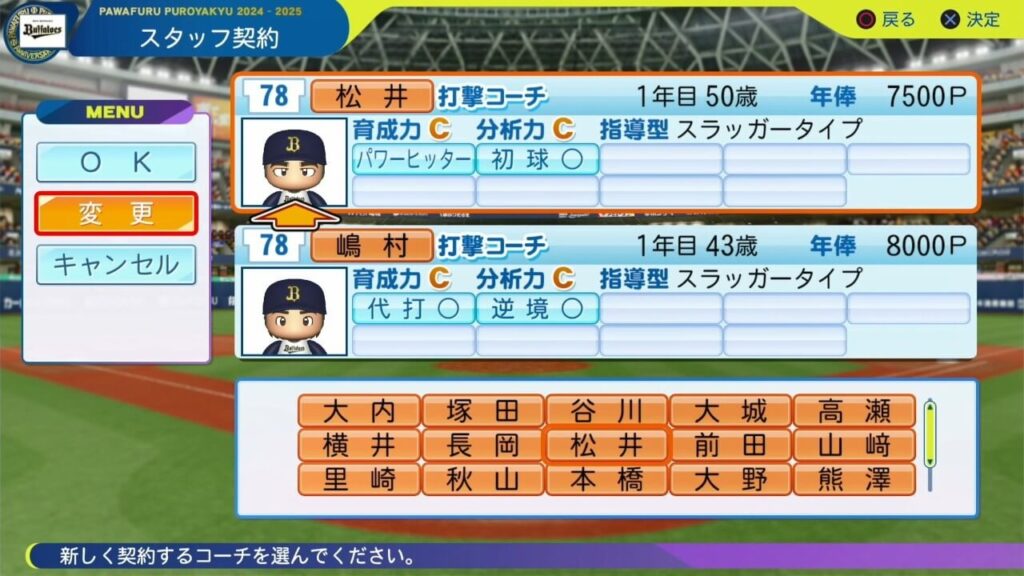3年目オフから出てくる、橘コーチ、松川コーチが有能なので、それまではテキトーBBくらいのコーチを置いてしのぐのがいいかなと思います。