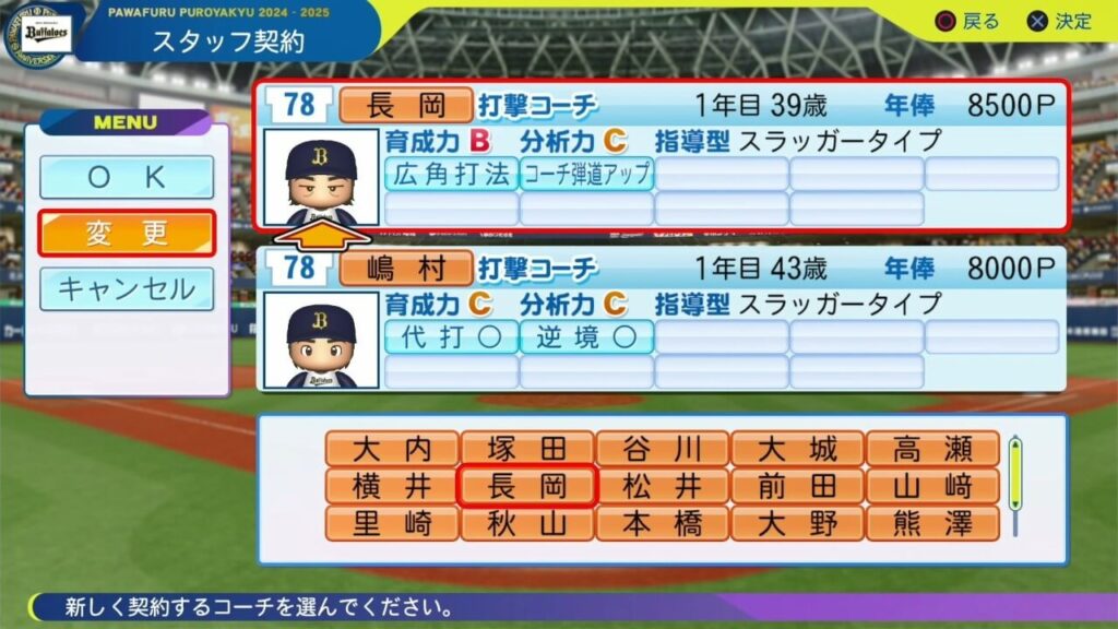 まあ野手は好みでつけたい特能に応じて選べばよいと思いますが、個人的には長岡コーチです。